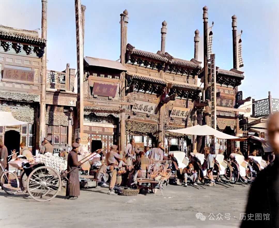 从牌楼上的题额看,这里聚集着一些香蜡铺和茶叶店。牌楼前停着不少黄包车,车夫坐在车上等待载客。可见,这条街相当繁华,而且人流量很大。