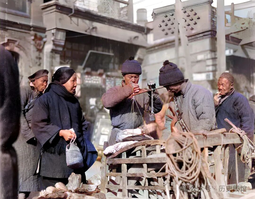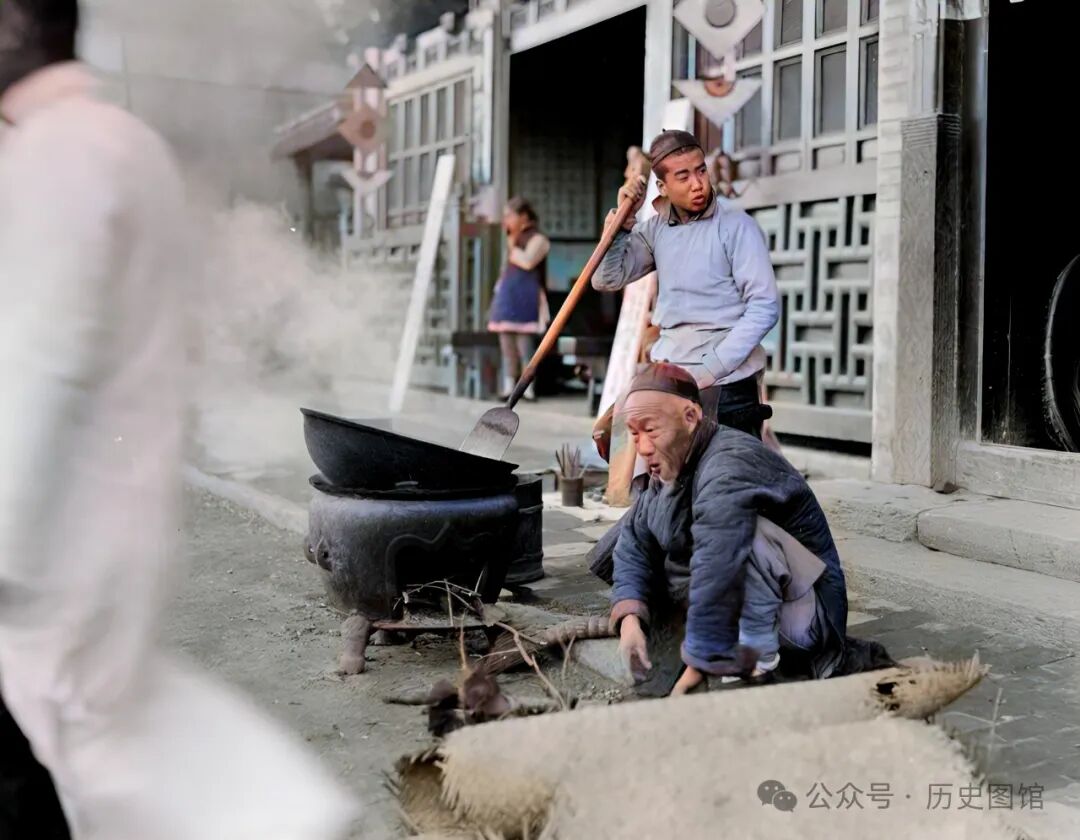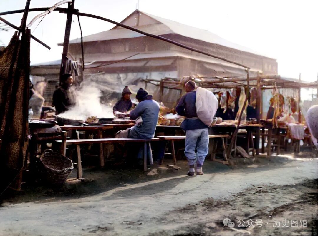 100多年前,北京街头一处路边摊,锅里正冒着热气。摊位前摆有长条桌子和板凳,食客坐在凳子上品尝美食。从照片上看,这应该是一个老摊了。