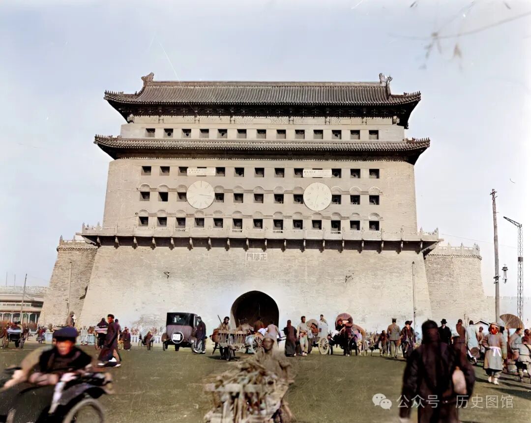 100多年前的北京正阳门箭楼上,挂着两个巨大的钟表。仔细看,上面的指针走得不一样。正阳门前,有不少拉车的百姓,一派繁忙景象。