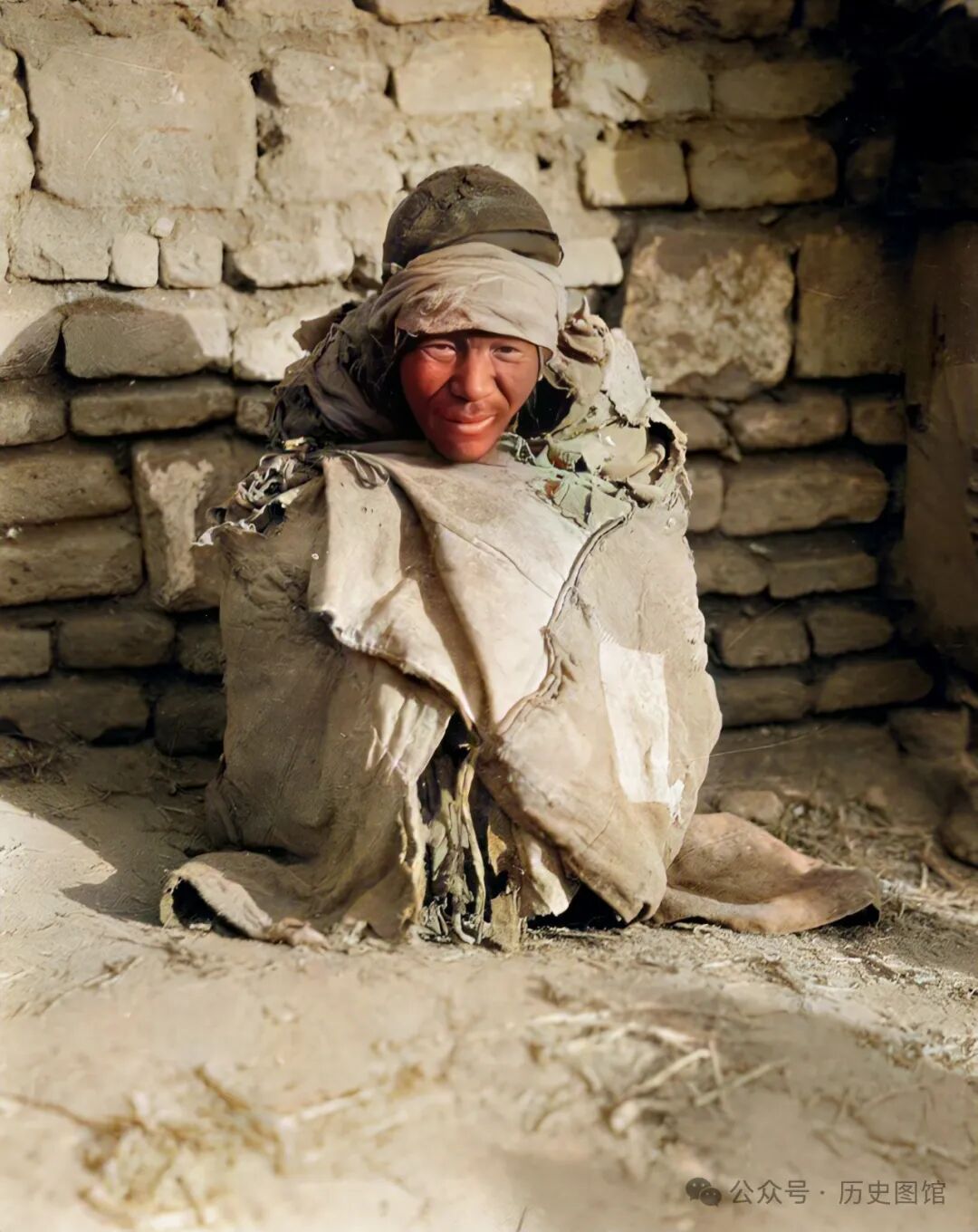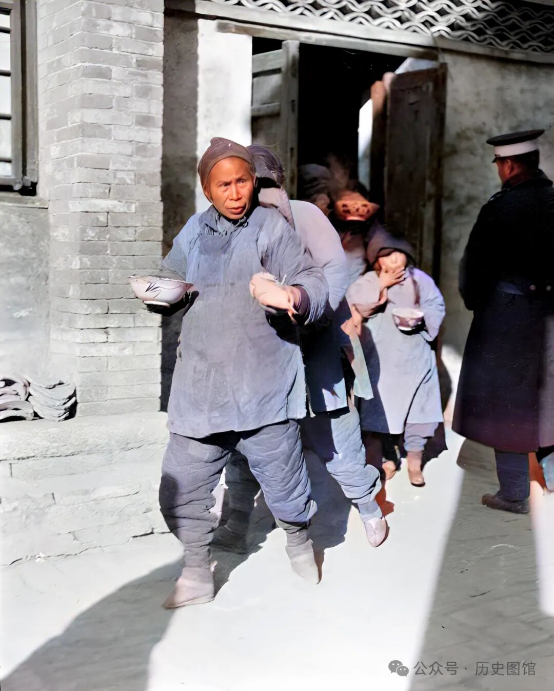 100多年前,在北京一个粥场,一名老太太右手端着一碗粥,左手拿着红薯从施粥点走出来。后面跟着几个孩子,也端着碗,还把手指放进嘴里吮吸。