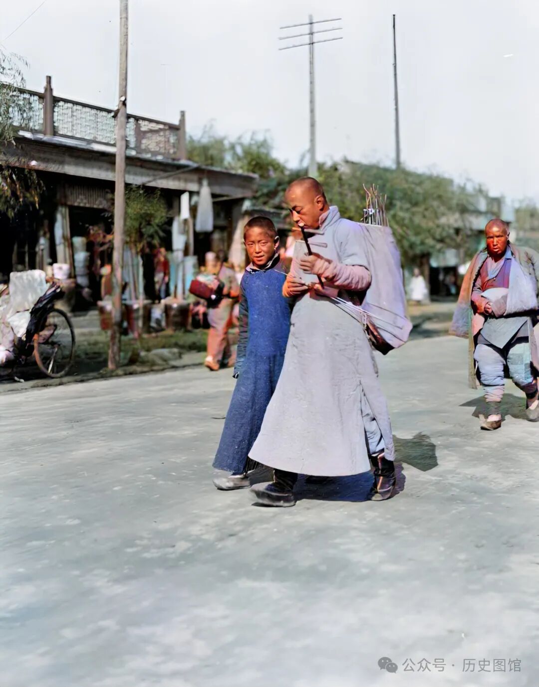 100多年前的北京街头,一位盲人手里拿着二胡,边走边演奏。身边跟着他的孩子,帮其带路。盲人还背着一个大布袋,里面装着一些待售的商品。