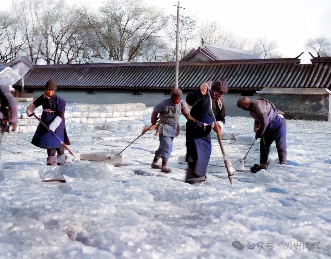 寒冷的冬季,北京城内一处冰窖,几名工人正在摆放从河里开采来的冰块。他们将一米见方的冰块整齐码放好。为了御寒,他们都穿着厚厚的棉衣,脚上穿着厚棉鞋。