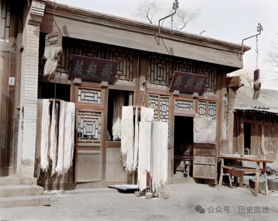 1917年,北京街头一家挂面店门口景象。店面不大,门头上写着“挂面庄”的匾额。门口屋檐下悬挂的架子上,晾晒着制作好的面条。旁边一家店铺,门头上写着“源兴斋”字样。