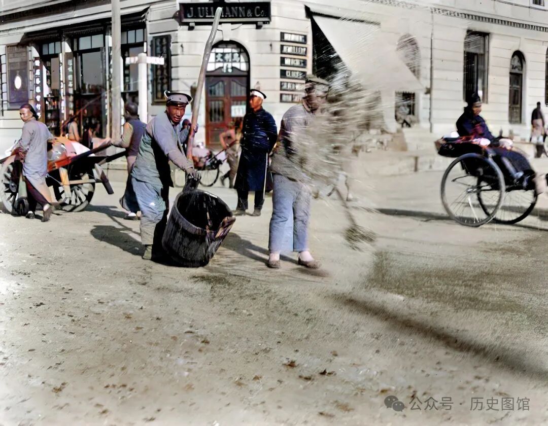 1917年,北京一个十字街口。两名身穿制服的警察正在打扫街道,他们抬着一大桶水,其中一名警察用长柄勺子往街道上泼洒清水除尘。