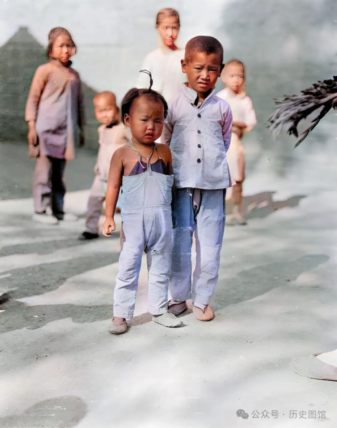 北京遂安伯胡同里,几个孩子正在一起玩耍。他们身上穿的衣服各不相同,尤其是穿着肚兜的孩子,头上扎着一个冲天辫,看上去滑稽又可爱。