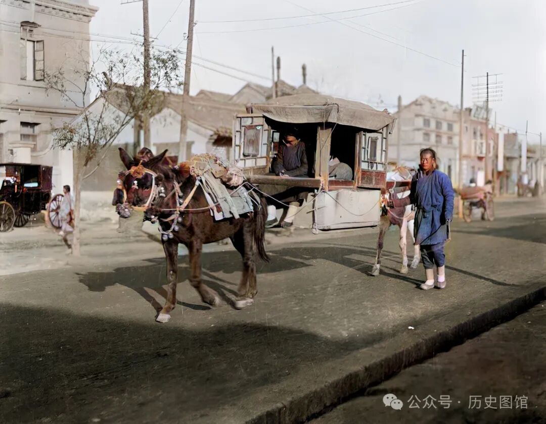 1917年,当地人乘坐骡轿从街上走过。骡轿,是北方一种非常独特的轿子,前后是两头骡子,共同抬着一顶长方形轿子,轿夫牵着缰绳跟在旁边。
