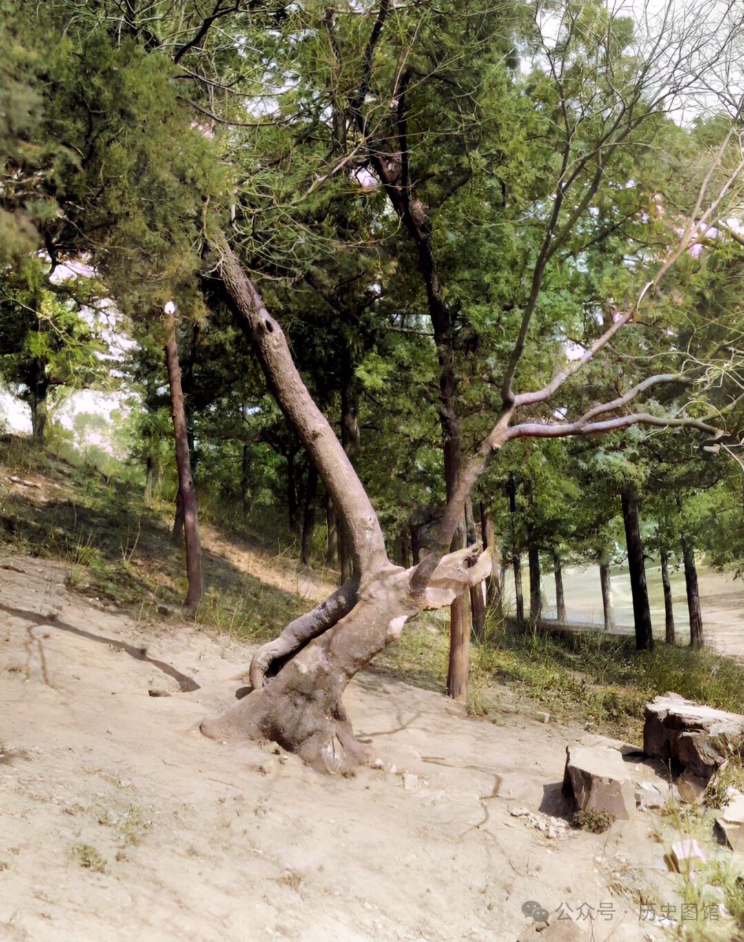 照片中这棵树,就是当年崇祯皇帝自缢的那棵歪脖树。它位于北京景山上的衍泽门附近,歪脖树下面,还有一堆石头假山。从照片上看,这棵树不像是槐树。