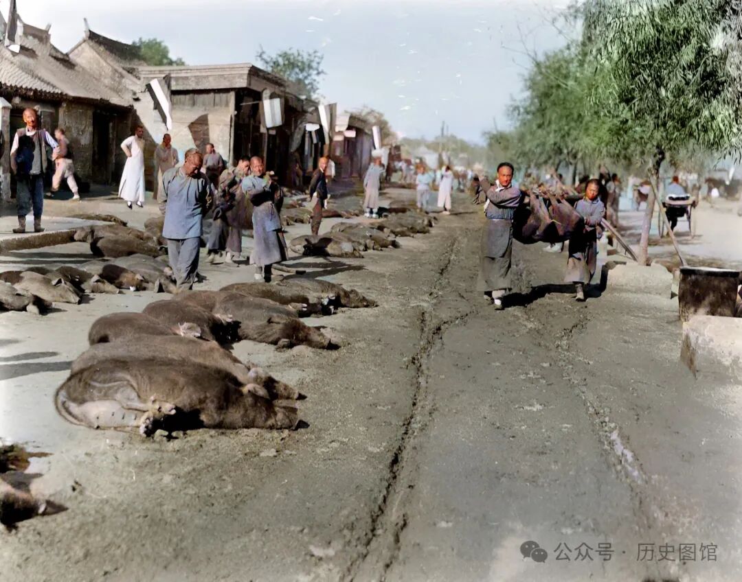 1917年,位于北京郊区的一条老街道,路边的地面上,放着几十只大黑猪。这些黑猪的四肢被捆着。原来,这是一个生猪交易市场。