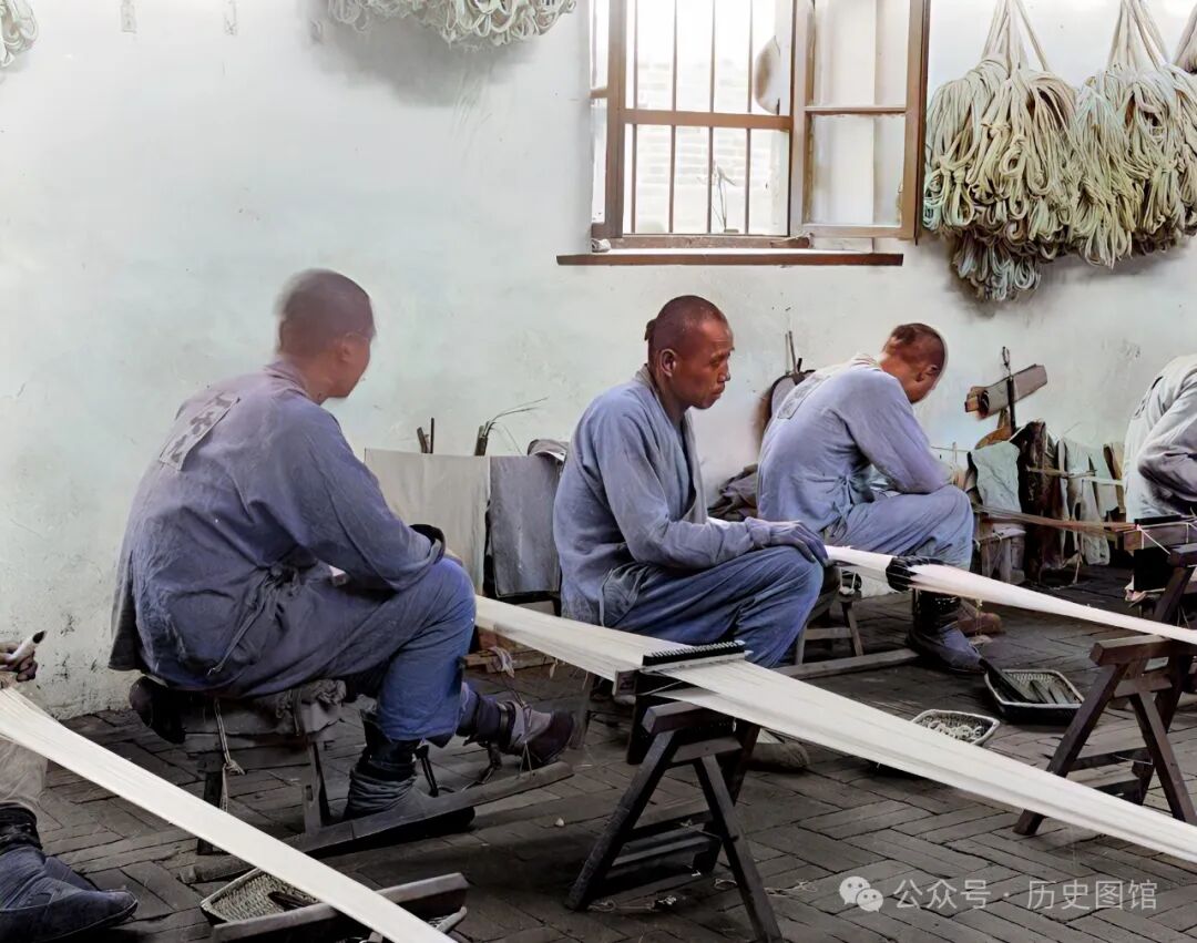 1917年,京师监狱里,几名犯人正在制作纱线。他们看上去都很年轻,因为犯下了罪责,被关进监狱,接受劳动改造。