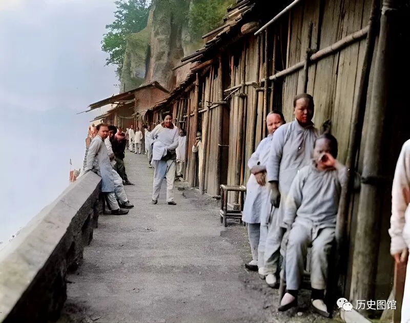 1917年,甘博来到了重庆一座石桥上,这座桥除了平时通行,桥的边上还有一条过道,有些商铺开门营业。建筑古色古香,店铺门口撑着遮阳棚,绳子上晾晒着衣服。整个画面很有生活气息。