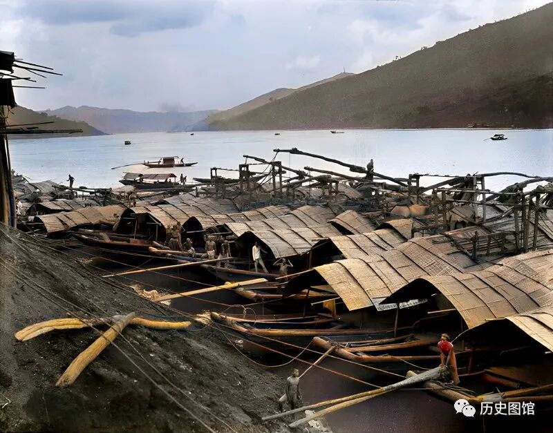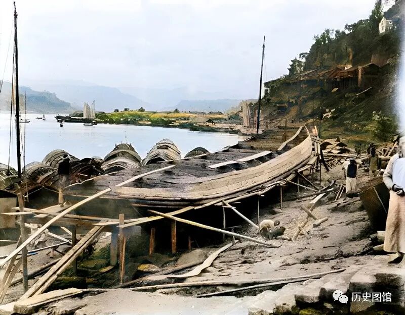 民国时期,江边这种小的造船厂很多,他们建造的木船,在江上运货或载客。