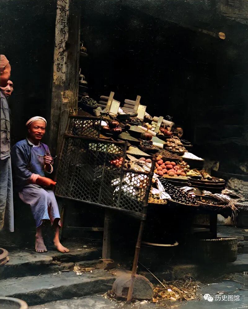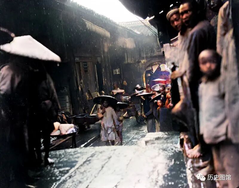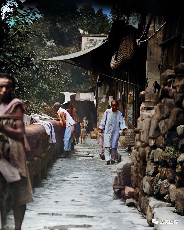这是1917年重庆的一条小街道,当时正下着雨。街道上铺着青石板,两旁的建筑古色古香。