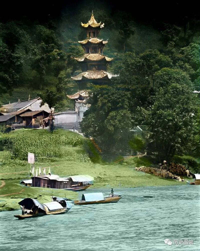 甘博乘船沿江而上,途中看到江边有一座高塔,塔下有一座寺庙,庙和塔的名字也不得而知。岸边,停泊着一些小船,可能是有人过江来到这里祭拜。