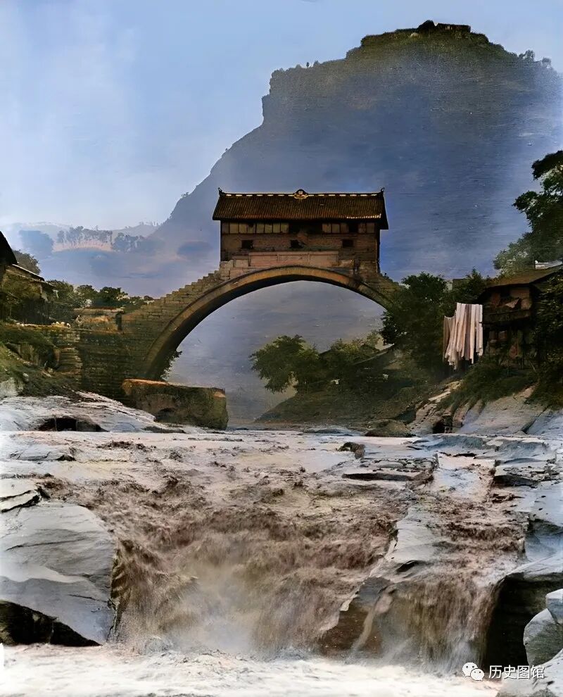 这是当时重庆万县(现在的万州)苎溪河上的一座石拱桥,造型十分优美,桥上还建有桥亭。拱桥长十丈,宽二丈八尺,高五丈八尺,建于清同治九年(1870年)。