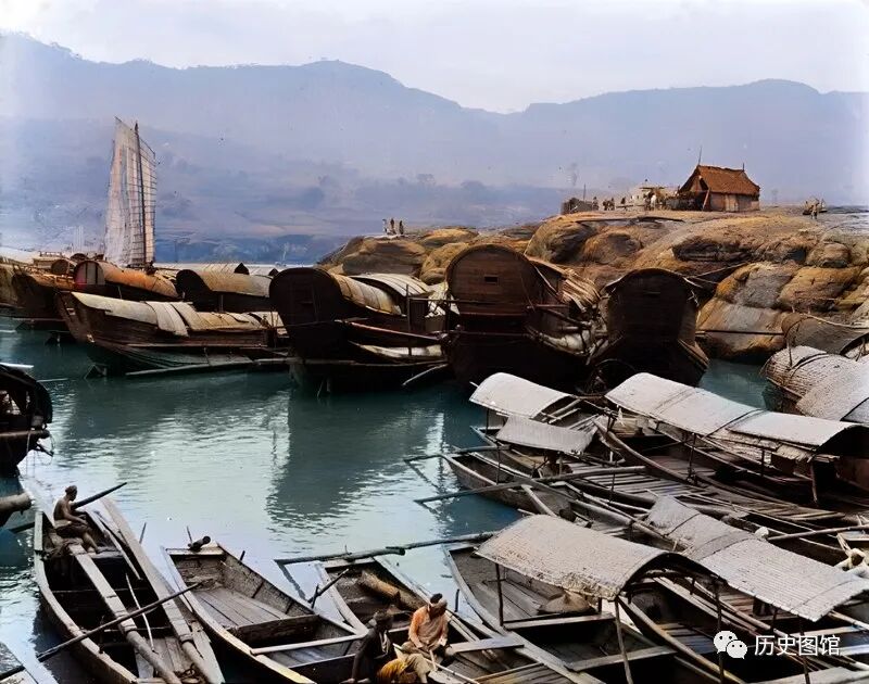 这张照片拍摄于涪陵泗王庙码头,码头上停靠的船只很有特色,船头都歪向一边。这种船当时叫“厚板船”,船尾两舷很不对称。