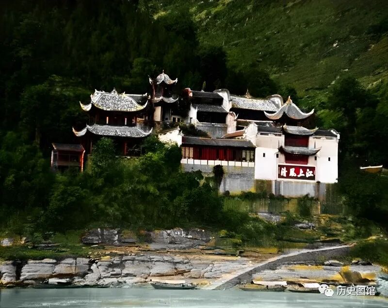 甘博的船途经云阳时,拍下了飞凤山山脚下的张飞庙。庙壁上“江上风清”四个大字十分醒目。张飞庙,也叫“张桓侯庙”,始建于蜀汉末年,据说张飞的头颅埋葬在此地。清末民初,庙壁上的“江上风清”,被换成了“灵钟千古”。
