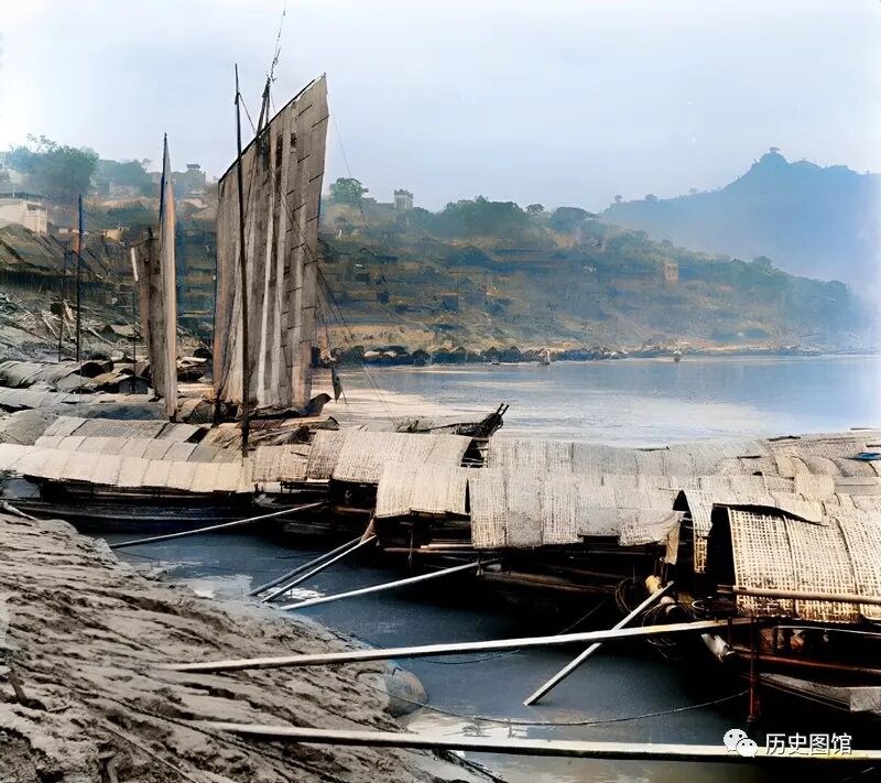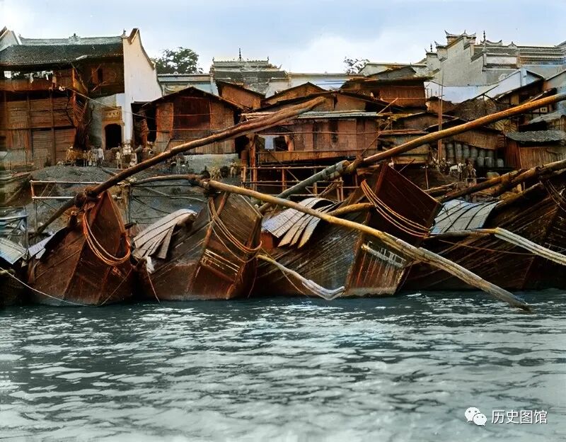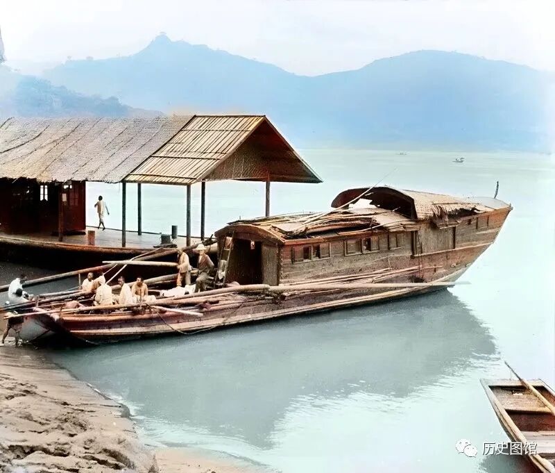 1917年,甘博来到了重庆的万县码头,停靠在岸边。这时,他看到了江边有一艘船,一直停在岸边,上面还有顶棚。船工告诉他,这种船叫“趸船”,经常是固定在岸边,用来当浮码头使用,用于装卸货物或供行人上下。甘博觉得很神奇,就拍下了这张照片。