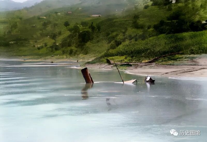 江边的浅水区里,不知为何有一艘沉船,露出水面的铁管是蒸汽船的烟囱。民国时期,长江航运发达,大小船只来往穿梭。除了依靠人力驱动的船只外,也有一些蒸汽船。可能这艘蒸汽船因为一些原因搁浅在了江边。