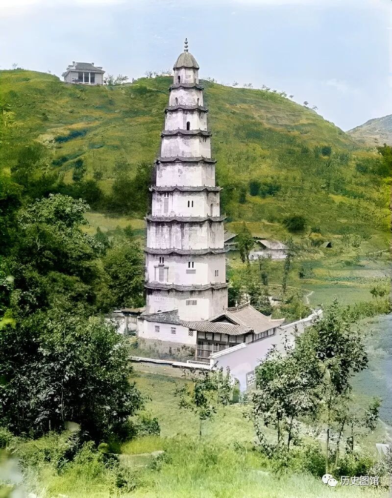 青山脚下,有一处寺庙。寺庙规模不大,临水而建。寺庙院内还有一座白色的高塔。该塔呈八角形,一共有9层。这座寺庙和高塔,甘博没有在照片上标注名字,因此,我们不得而知,或许只有当地人才知道吧。