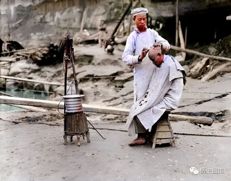 街边,一名理发师正在为顾客理发。这种理发师在当时很常见,他们挑着担子。担子的一头是理发工具,挑子的另一头是火炉和水盆。