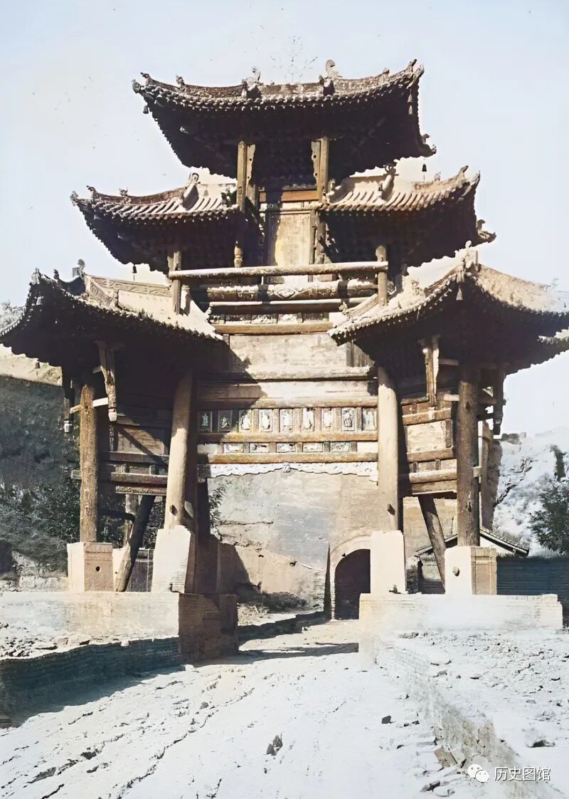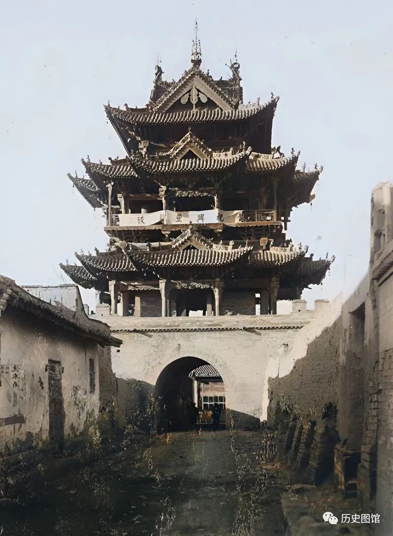 这是40年代山西运城的一座古城楼,城门前是一条主干道,从这里进去就进城了。城楼高耸入云,飞檐高挑、雕梁画栋,一共建了三层。道路两旁建有围墙和一些民房。有两名男子正从城门下通过。在城楼上方,还悬挂着一个条幅。