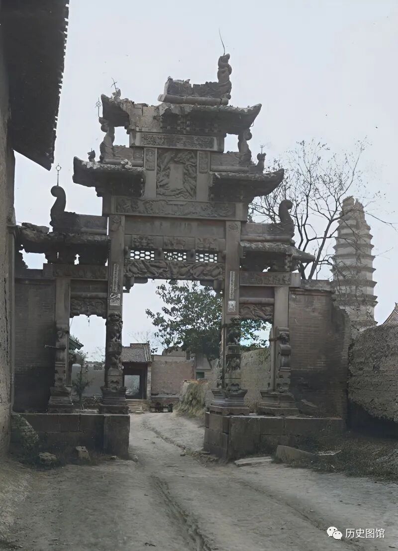 这是40年代安邑县城的面貌。街道中央,矗立着一座高大的三门石牌楼。上面雕刻着精美的浮雕图案,牌坊下是一条土路,马车压出了深深的车辙。远处,还能看到一座古塔。现在,这样的古建筑,很少见到了。安邑,历史悠久,古代是夏朝的都城。