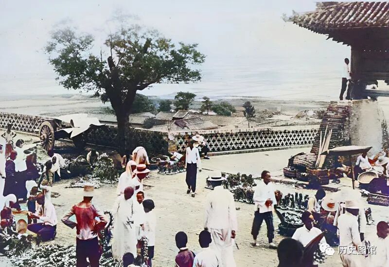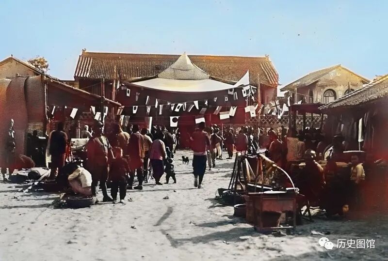 40年代山西运城,热闹的集市上人群熙熙攘攘。照片正中,应该是集市的中心建筑,类似戏台。上面搭着棚子,棚子四周悬挂着各国的小国旗,好像正在举行一场活动。街道两旁,有一些摆摊的摊贩。人群中,还能看到一些身穿军装的日本兵。