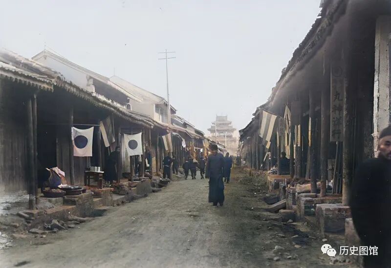 40年代山西运城老街,街道笔直。路的尽头,隐约能看到高耸的城楼。道路两侧是中式风格的建筑,古色古香,沿街店铺生意兴隆。在一些门口悬挂着不同国家的旗帜,这应该与当时的历史时期有关。