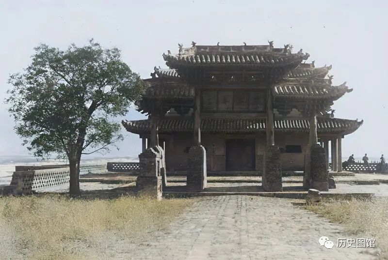 这是40年代解州关帝庙外面的景象。关帝庙因临近关羽的原籍,因此也被称为武庙之祖。关帝庙始建于隋开皇九年(公元589年),后代多次扩建和重修。清康熙四十一年(公元1702年)毁于一场火。又经10多年才得以修复。