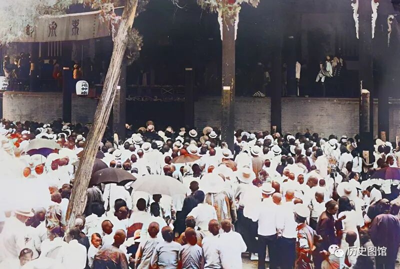 40年代,解州关帝庙大祭典盛景,大门前,很多人来看热闹,人山人海热闹非凡。大门上拉着一条横幅“庆祝解县关帝庙大祭典”字样。庙门前一些小商贩在摆地摊。台阶上坐着很多军人,看装扮像是日本人。