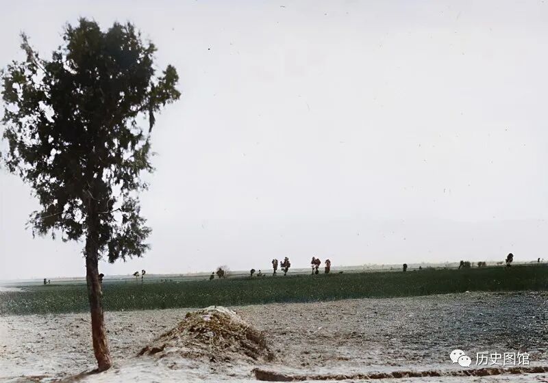 这张照片拍摄于运城郊外,最近处有一座坟茔,旁边矗立着一棵柏树。远处,是一望无际的田野,地里面的庄稼长势良好,几名农民在地里劳作。