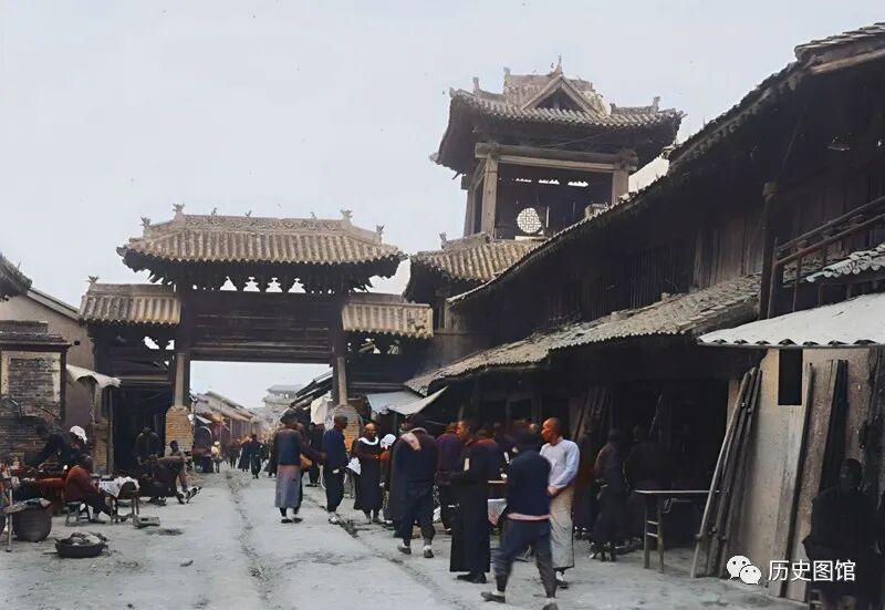 这是40年代的安邑古城。街道笔直,路中间压出了深深的车辙。道路两侧的中式建筑古色古香,两旁的是沿街店铺,正在开张营业。现在,这样的古建筑,很少见到了。安邑,历史悠久,在战国时期是魏国的都城。安邑古城分为大城、中城、小城和禹王庙四部分。