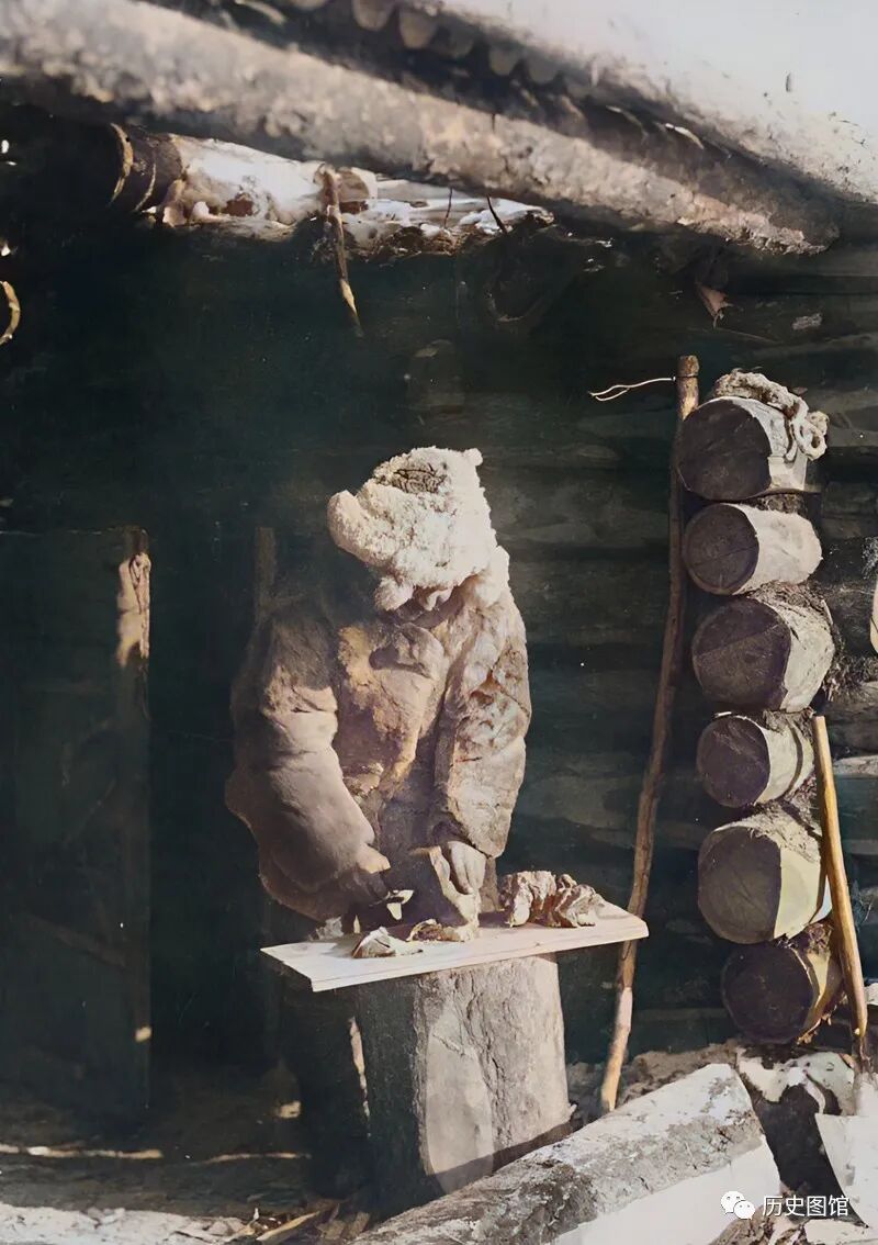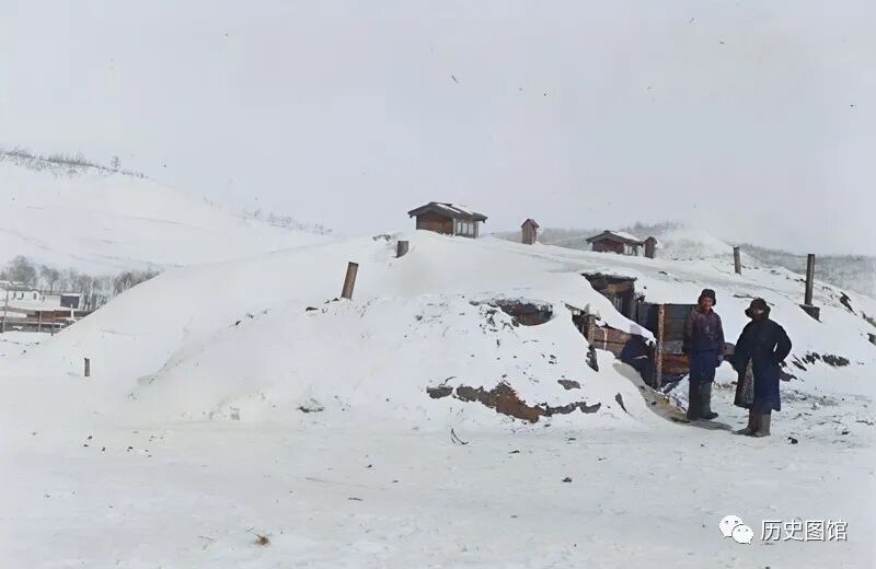在大兴安岭林区,除了由木头搭建的木屋外,还有一种房子,就是在地上挖洞,上面撑起木头,覆盖上泥土,做成半地下的房子,在顶部建上烟囱和透气窗,这种房子冬暖夏凉。照片中,两名村民正站在自家的土屋前。房子上覆盖着厚厚的积雪,还能起到保暖作用。