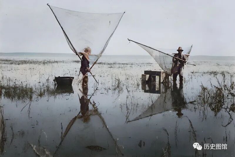 两名渔民在呼伦湖浅水区捕鱼,他们使用的渔网很特别,用两根长木棍和两根短木棍撑起一张网。别看这种渔网简单,但是很好用,两名渔民带的木盆和木箱里,已经装满了鱼。呼伦湖,是呼伦贝尔大草原上主要湖泊之一,素有"草原明珠"之称,是中国第四大淡水湖。