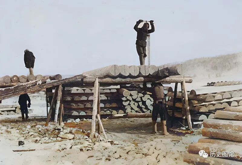 大兴安岭林场附近,林场工人正在锯开砍伐下来的原木。巨大的木材,需要用大锯分解开来,方便存放和运输。
