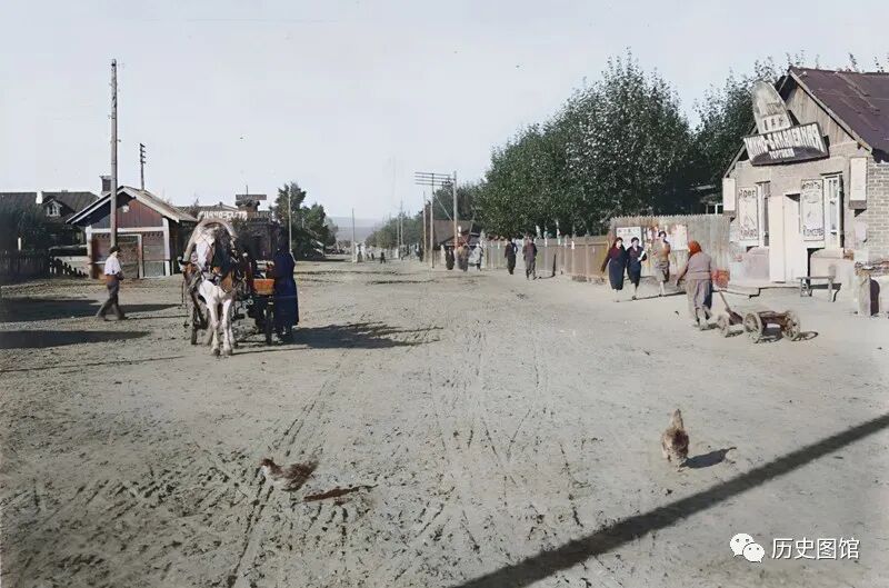 这是当时位于满洲里海拉尔的一处街道,街道宽阔,两侧是民房等建筑,没有十分高大的建筑,有些房子是欧式的。因这里临近俄罗斯,一些商店的广告牌上写得是俄文。马路上,一辆马车停在路边,等待乘客上车。