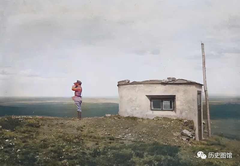 这张照片拍摄于满洲里,这里西邻蒙古国、北接俄罗斯。在辽阔的边境线上,有一处哨所,是一间很简易的房子。一名军人正站在高处,用望远镜观察远处的情况。满洲里,是一座拥有百年历史的口岸城市,融合中俄蒙三国风情,被誉为“东亚之窗”。