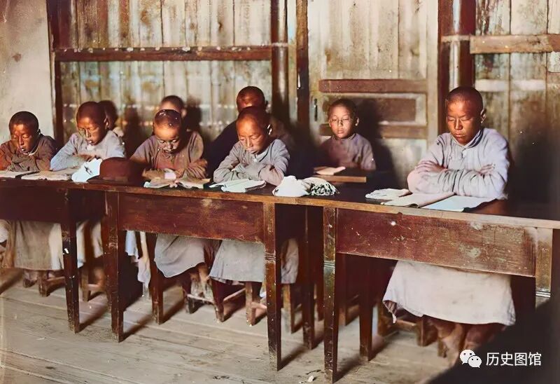 这是呼伦贝尔的一所小学。教室里,几名蒙族学生正坐在课桌前认证听讲。虽然身为游牧民族,他们深知学习科学文化知识的重要性,家长都会把孩子们送到学校里读书。这张照片拍摄于30年代。