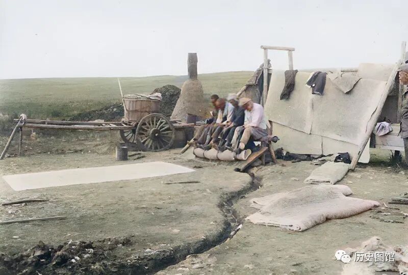 照片中,四名男子坐在板凳上,正在齐心协力制作羊毛毡,过程很复杂,也很有技术含量。从他们熟练的手法看,应该是专业的制作匠人。草原人很勤劳,他们把羊毛剪下来,手工做成羊毛毡。在他们身后的架子上,放着制作好的羊毛毡。