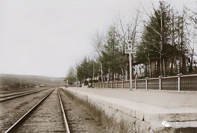这是中东铁路上的一座火车站——兴安站。站台左侧有数条铁轨,站台右侧是火车站站房。这座火车站,始建于1901年,位于牙克石地区兴安岭村、兴安岭隧道的西口方向。照片中,长长的站台上空无一人。