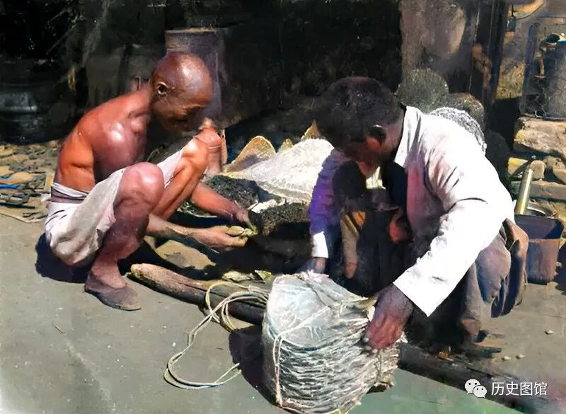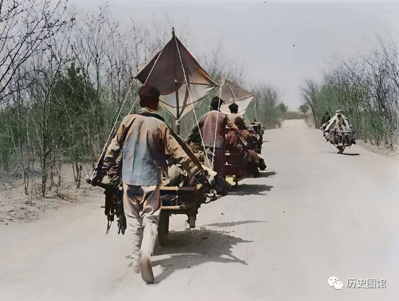 在40年代,几名男子正推着独轮车赶路,车上装满了货物。在几十年前,泰安当地这种独轮车很普遍。既可以拉货,又可以载人,是一种多用工具车。