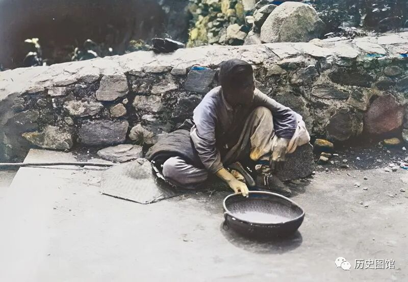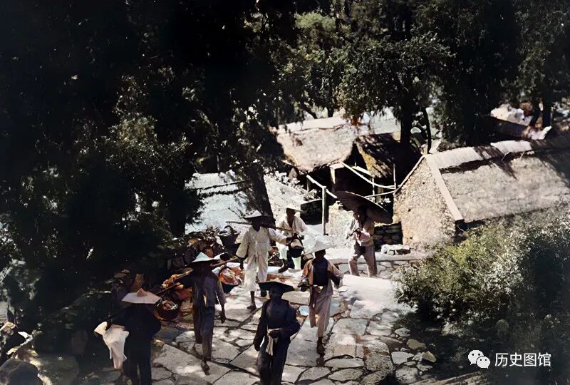 1931年,泰山五大夫松树下。一名路人坐在凳子上休息,另一名路人买了一碗粥。五大夫松,也叫"秦松","秦松挺秀"为泰安八景之一。
