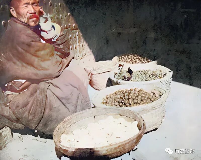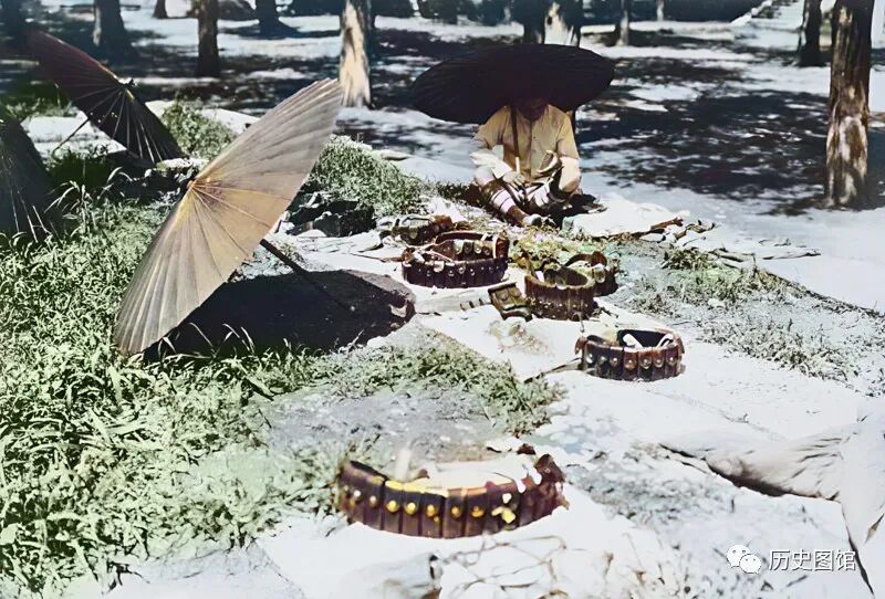 30年代的一个冬日,一名老人穿着厚棉袄,坐在庙门口的太阳光下。他面前的几个箩筐里,摆放着一些小吃和食品。正等着上山的游客前来购买。