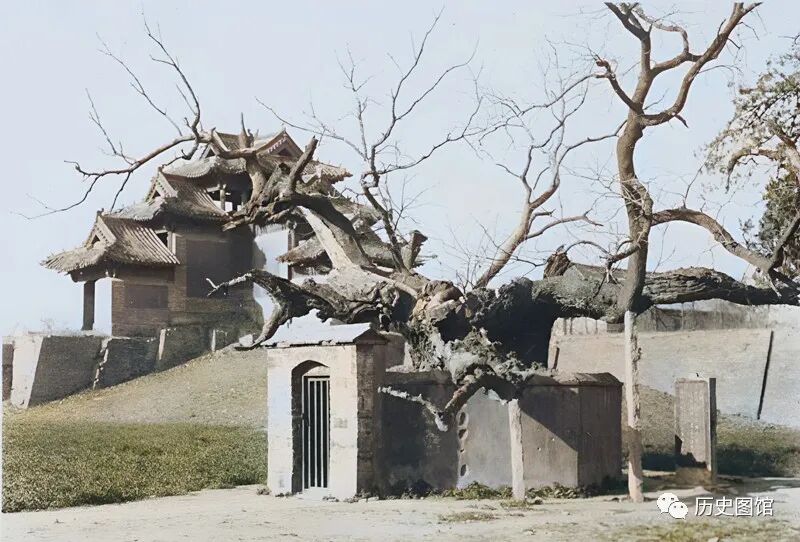 当时,这棵大槐树已经枯死,为了保留下这棵树,人们专门在树下修建了一圈矮墙,并留有一小门。1952年,人们在枯死的槐树干里种下新槐,如今已郁郁葱葱,俗称"唐槐抱子"。