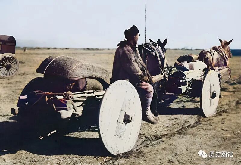 仔细看,这种马车的车轮很独特,不是太常见,它用木板制作而成。