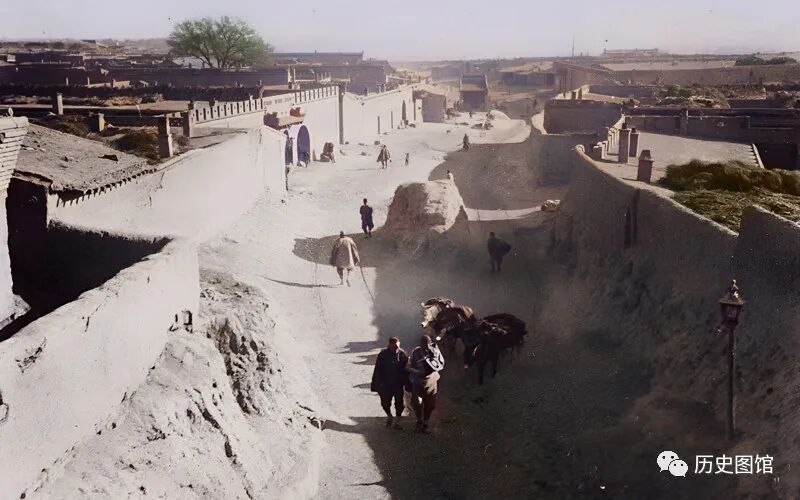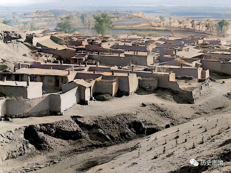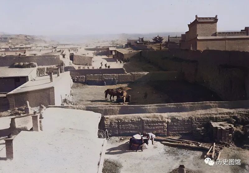 1939年,包头一座小镇上的景象。有高墙大院,也有低矮的民房。
