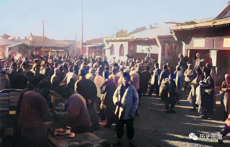 从照片上看,人们都穿着厚棉衣,应该是春节前夕。街道上挤满了前来赶集的人。