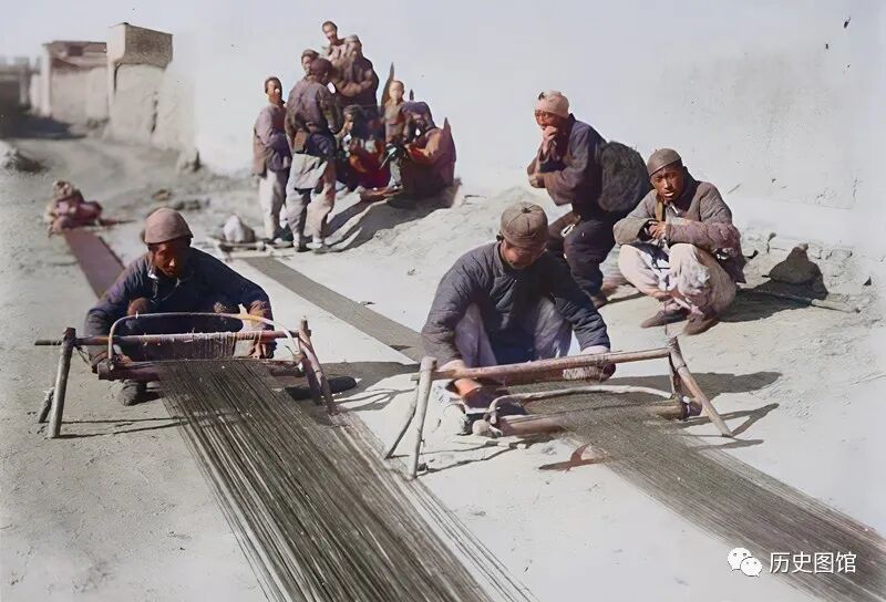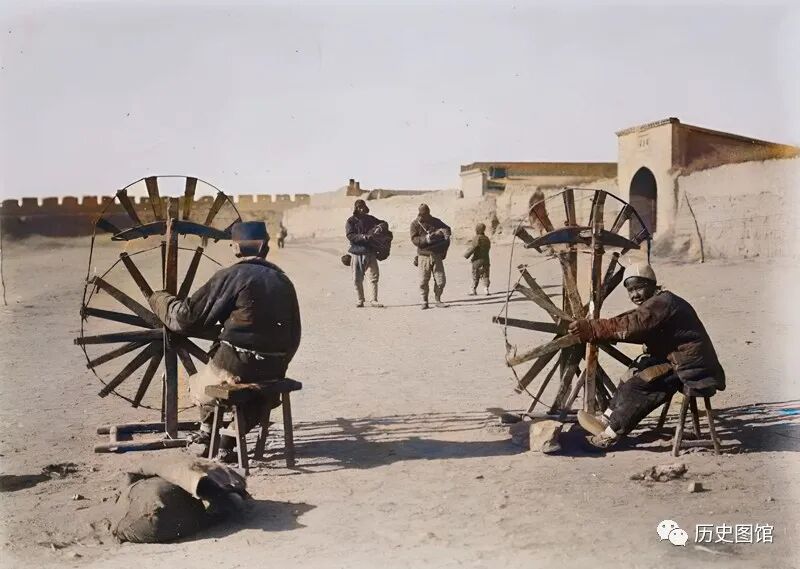 包头城外的空地上,两个人正坐在板凳上织羊毛。