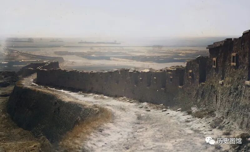 这是30年代包头镇城墙里面的情景。城墙高出地面数米,城墙上设有垛口和射击孔。