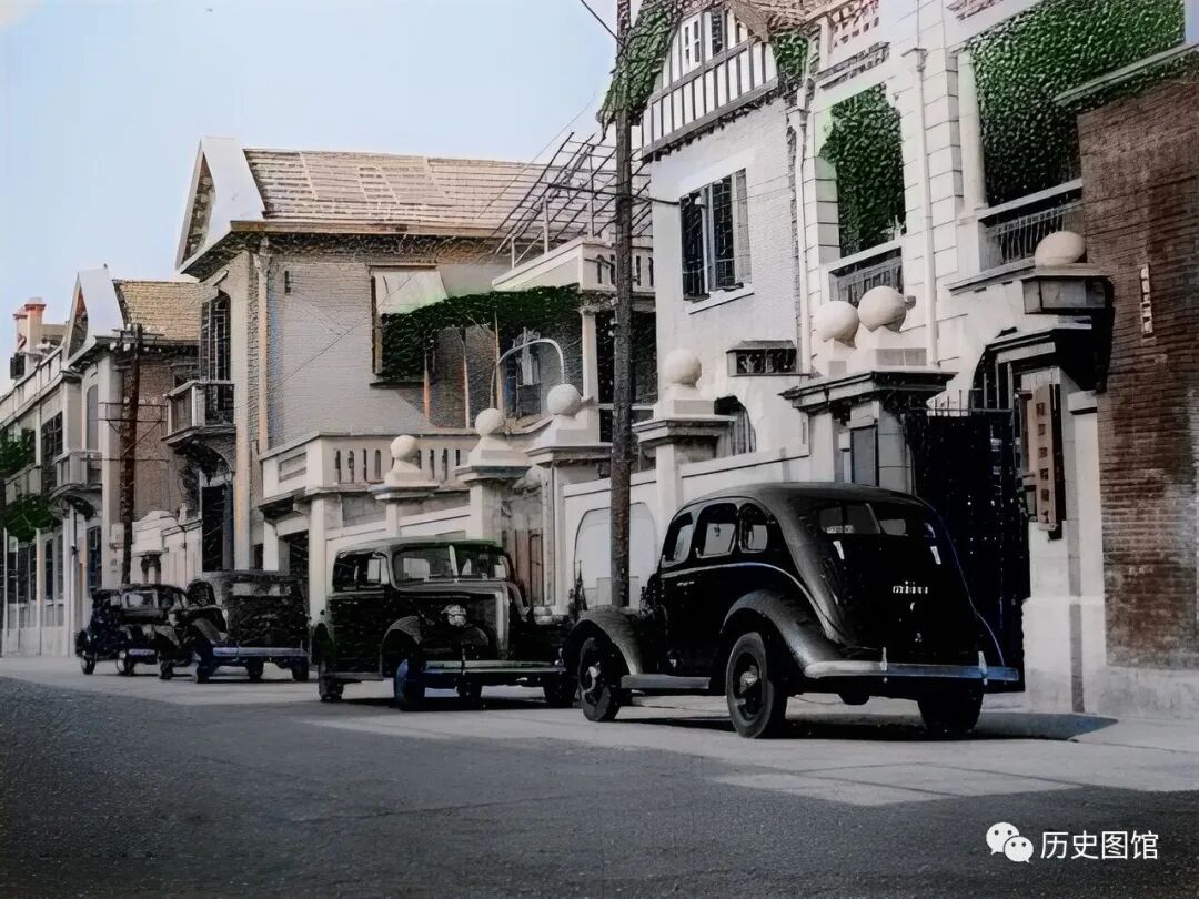这是当时法租界内的一个生活区。街边全是法式风格的别墅,大门前停着几辆轿车。当时的租界,中国人可以自由出入租界,而租界里的公园或者专供外国人游玩聚会的地方不允许中国人进入。